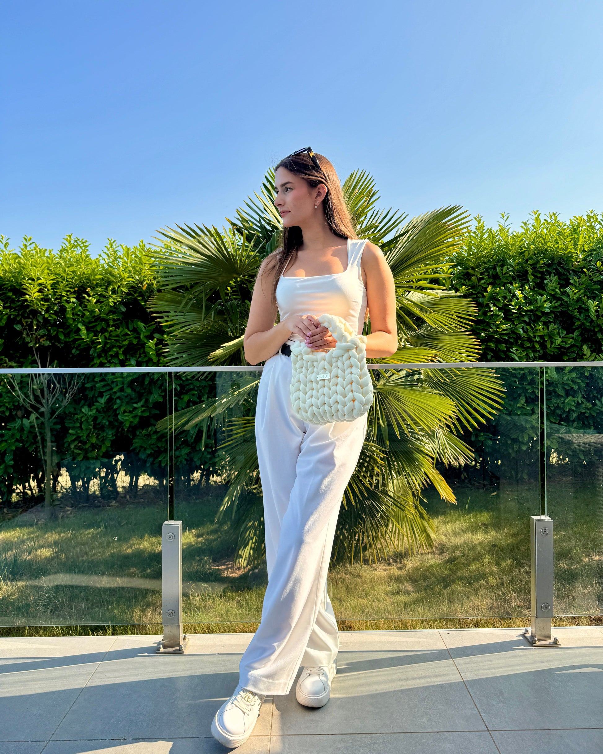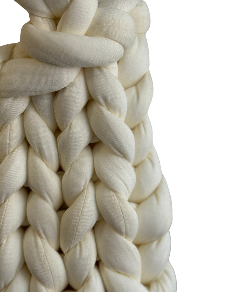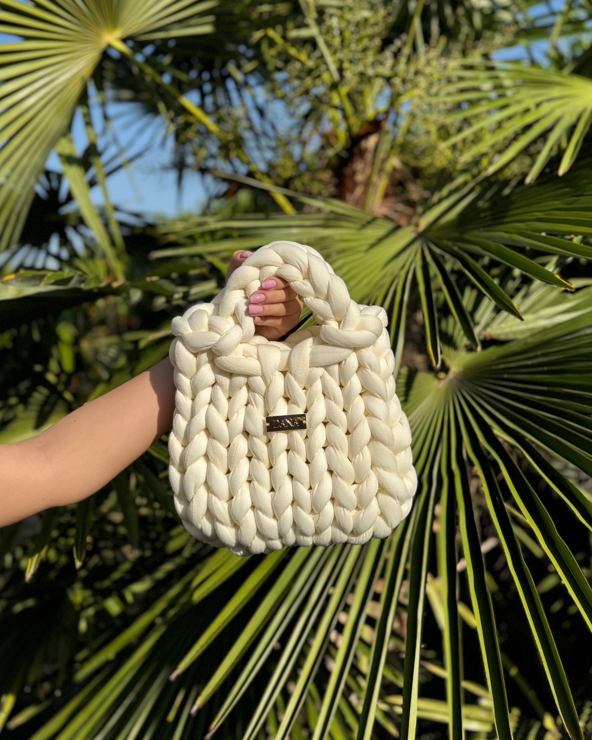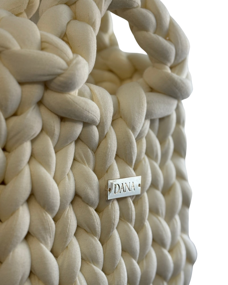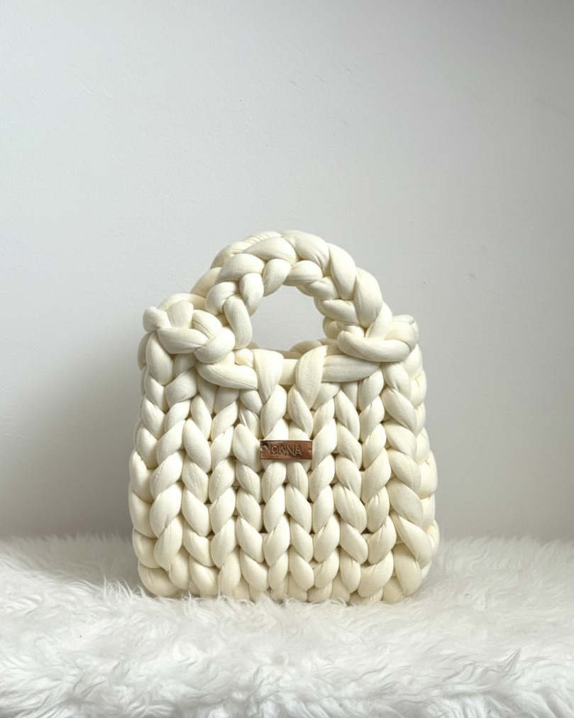 A kézi kötés során figyelünk minden részletre: a fonás irányára, a feszességre, az arányokra. Ez adja a DanaBag valódi karakterét.