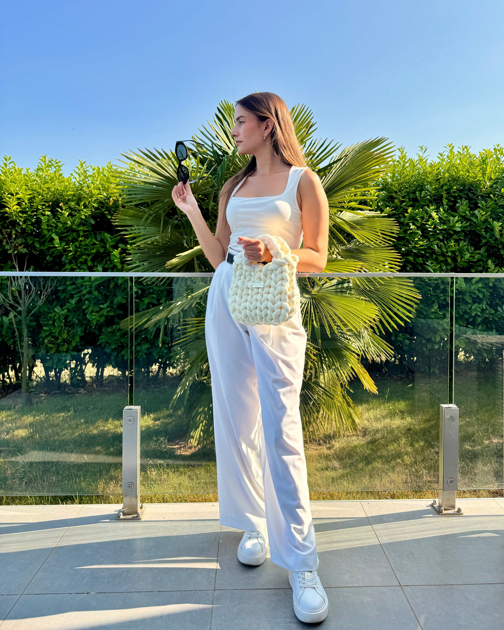 A táskák fonott szerkezete természetesen rugalmas, így vastagsága finoman alkalmazkodik a belehelyezett tárgyakhoz. Ezáltal megőrzi esztétikus formáját, miközben a mindennapi és alkalmankénti használat során is kényelmes marad.